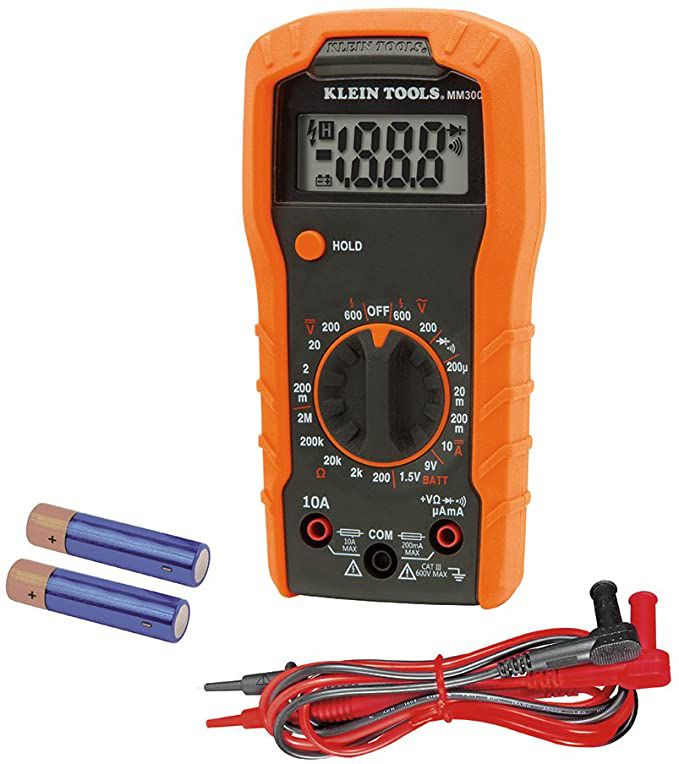 One of my favorites is Klein, but any voltmeter can work. Read the instructions for how to record DC voltage – you’ll want it set to 20 intervals for a battery.