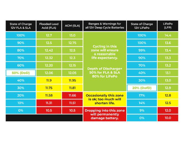 Once you have your two numbers you can find the percentage of charge on the chart. Let’s say you have a flooded battery that when full was 12.75VDC and after a day’s use is 12.20 VDC. From our chart, we can see that the battery capacity is likely 60% full.